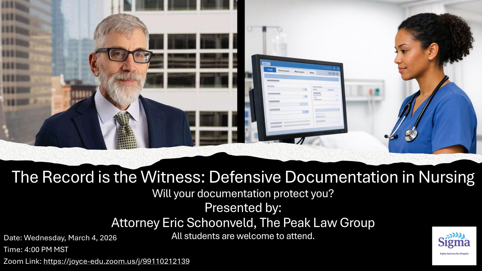 Alpha Gamma Nu is excited to present "The Record is the Witness: Defensive Documentation in Nursing" with Attorney Eric Schoonveld on March 4, 2026, at 4:00 PM MST. This session promises valuable insights and practical guidance for nursing professionals.